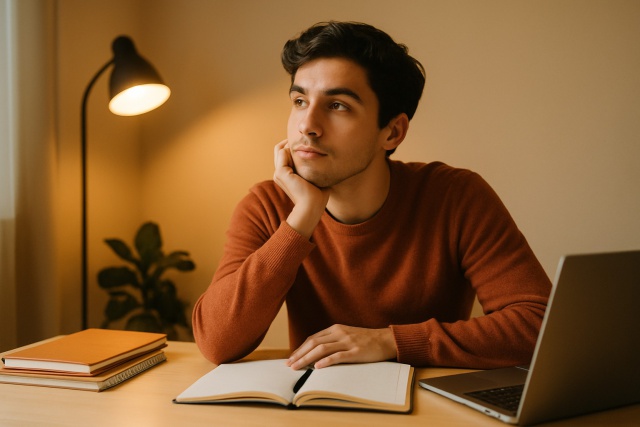 A student engaged in deep reflection, discovering unique perspectives for their college essay.